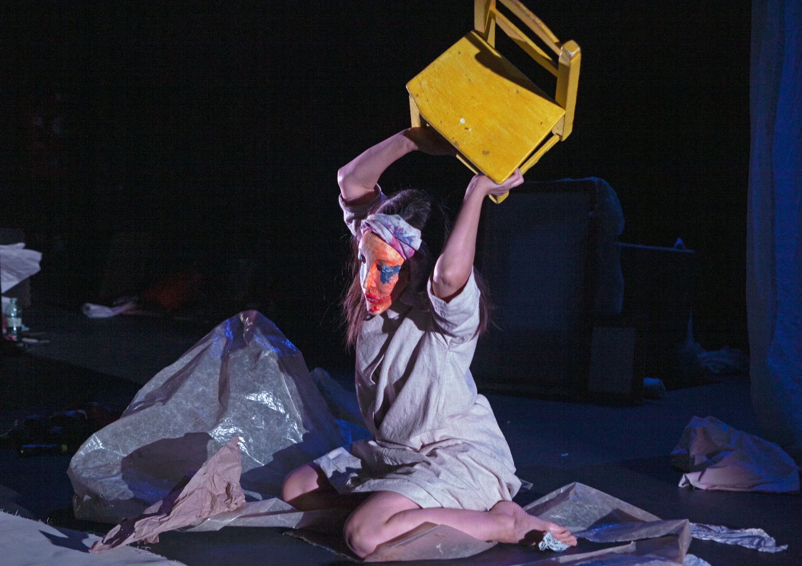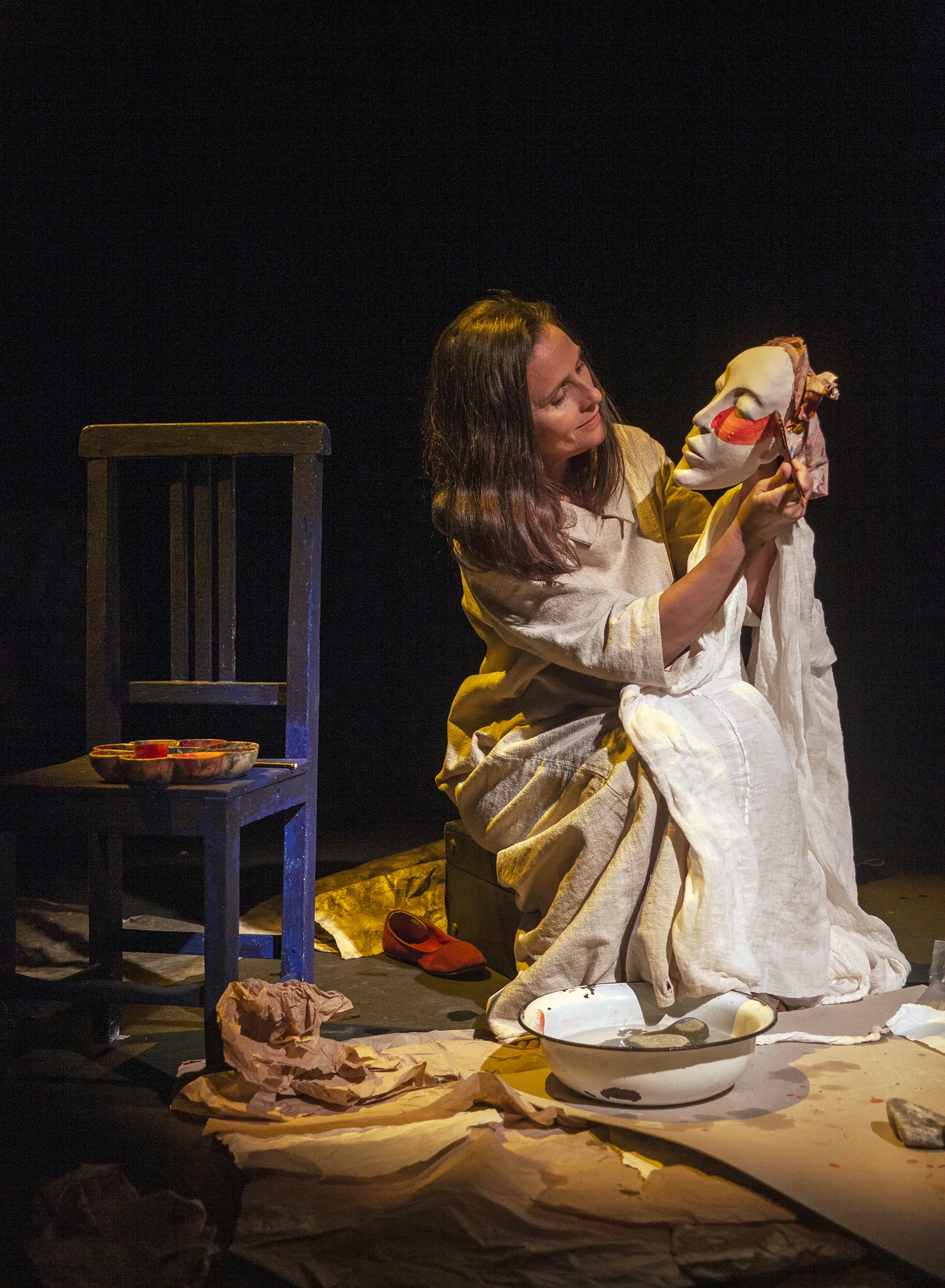 El eje escénico es la maleta que Charlotte entrega antes de morir: un contenedor de vida comprimida en color. Desde ella se despliega la acción: dos actrices-narradoras manipulan títeres, objetos y máscaras mientras una pintora-actriz da vida en directo a escenas proyectadas sobre una pantalla translúcida. Las pinceladas se amplifican mediante cámaras y mapping, generando un diálogo constante entre lo tangible y lo proyectado, entre memoria e imaginación.
