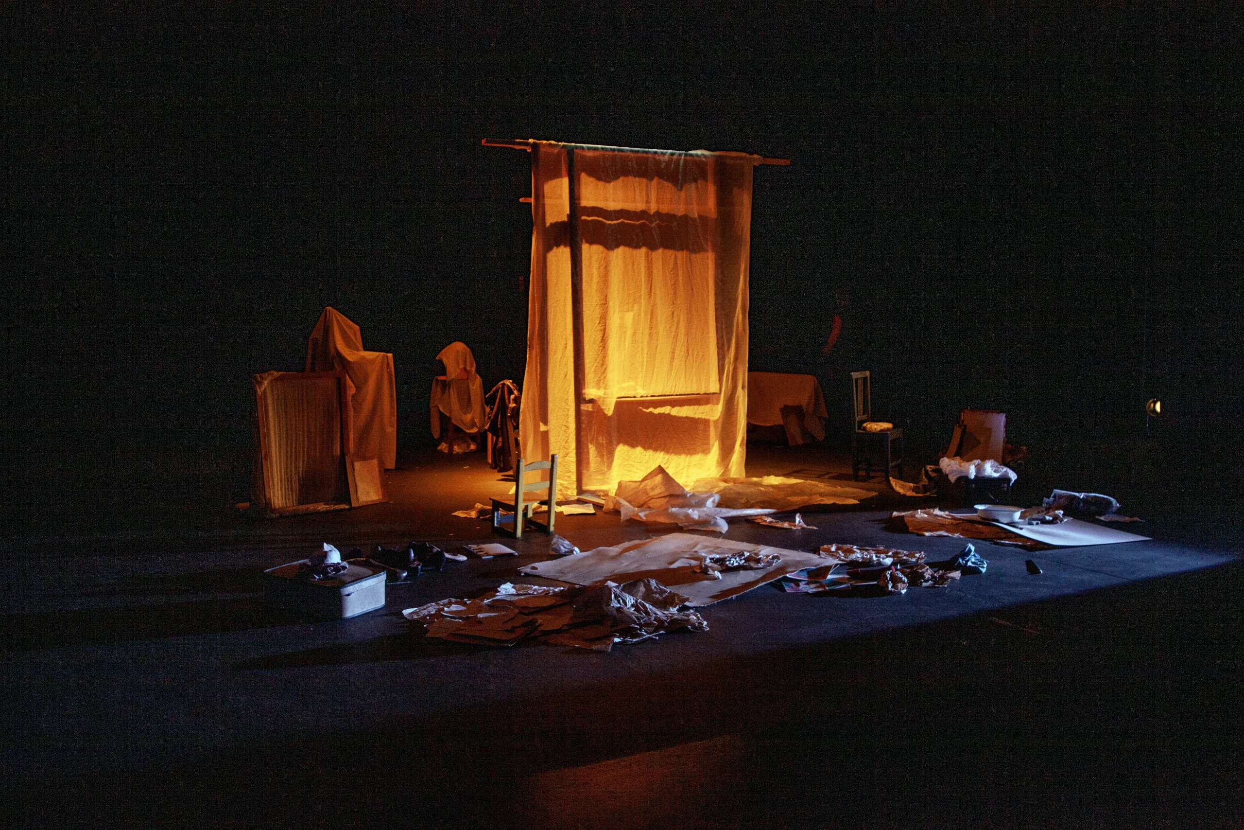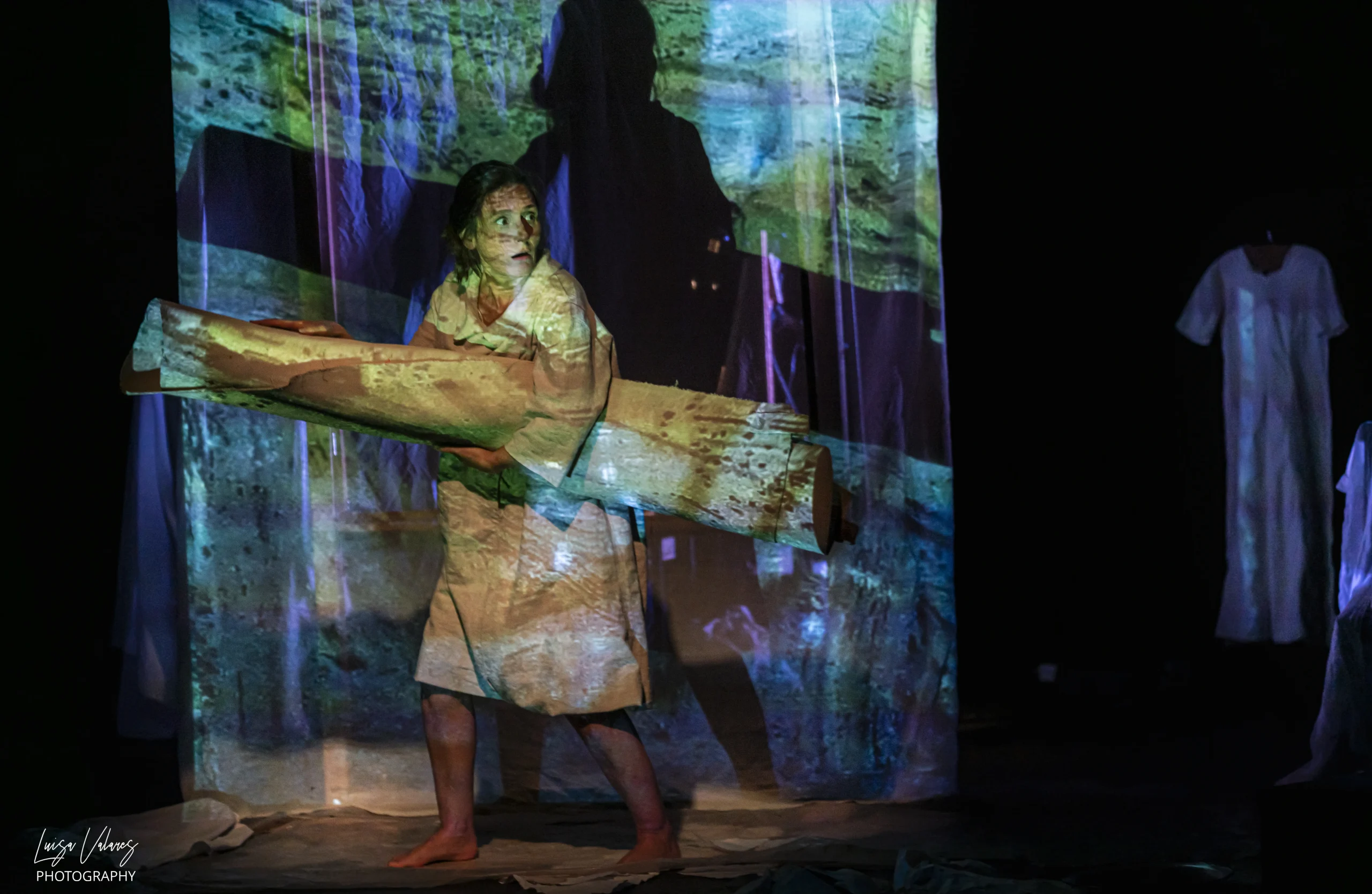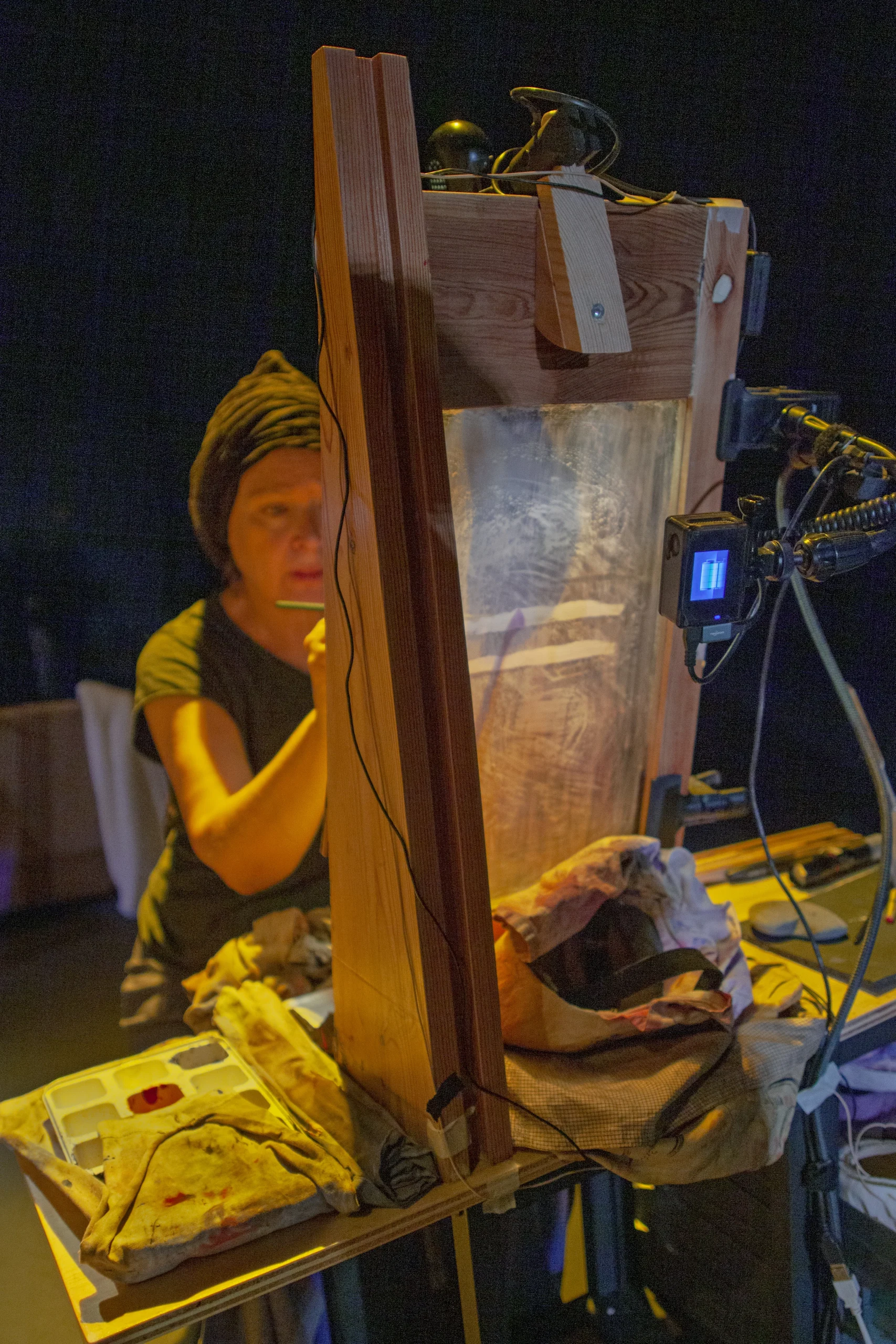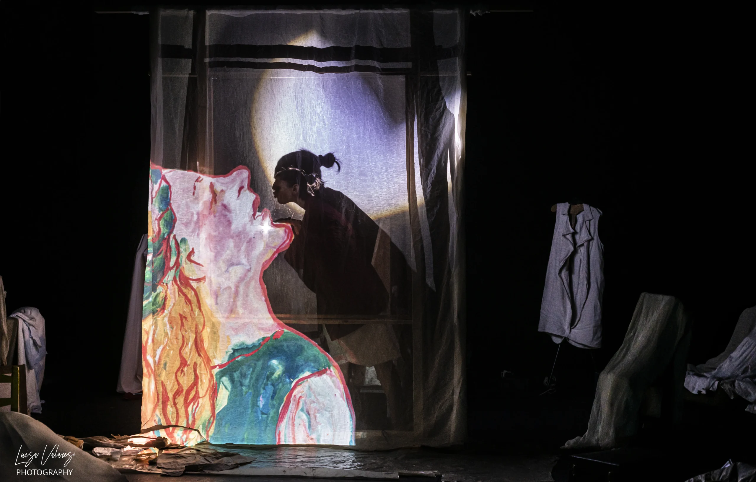 En medio de la escena, paralelo a boca, un rectángulo donde proyectar simboliza un lienzo o ventana por donde los personajes pueden lanzarse… ya sea artística o físicamente. Una gran pantalla o ventana que aparece y desaparece, sobre la que suceden las cosas, sobre la que proyectar procedimientos pictóricos realizados en directo, obra de la pintora y empaste de lo físico y real como si lo que sucediera en escena siguiera formando parte de la pintura.