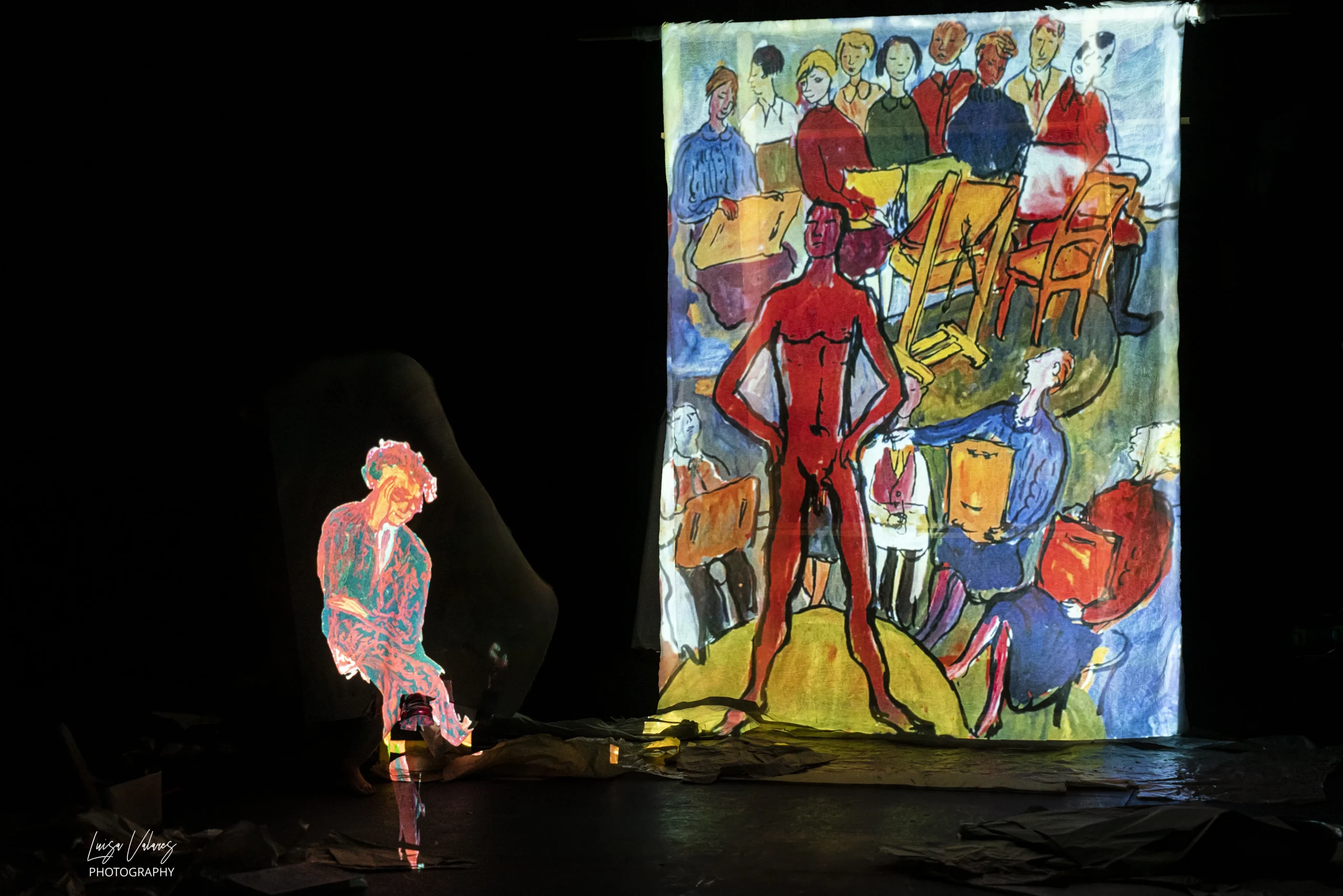 Proponemos un cruce entre lo artesanal y lo tecnológico: figuras articuladas, materiales reales y texturas en vivo conviven con proyecciones de alta sensibilidad estética. Todo con una voluntad sensorial: que el espectador no solo vea, sino que sienta la pintura nacer como acto de liberación.