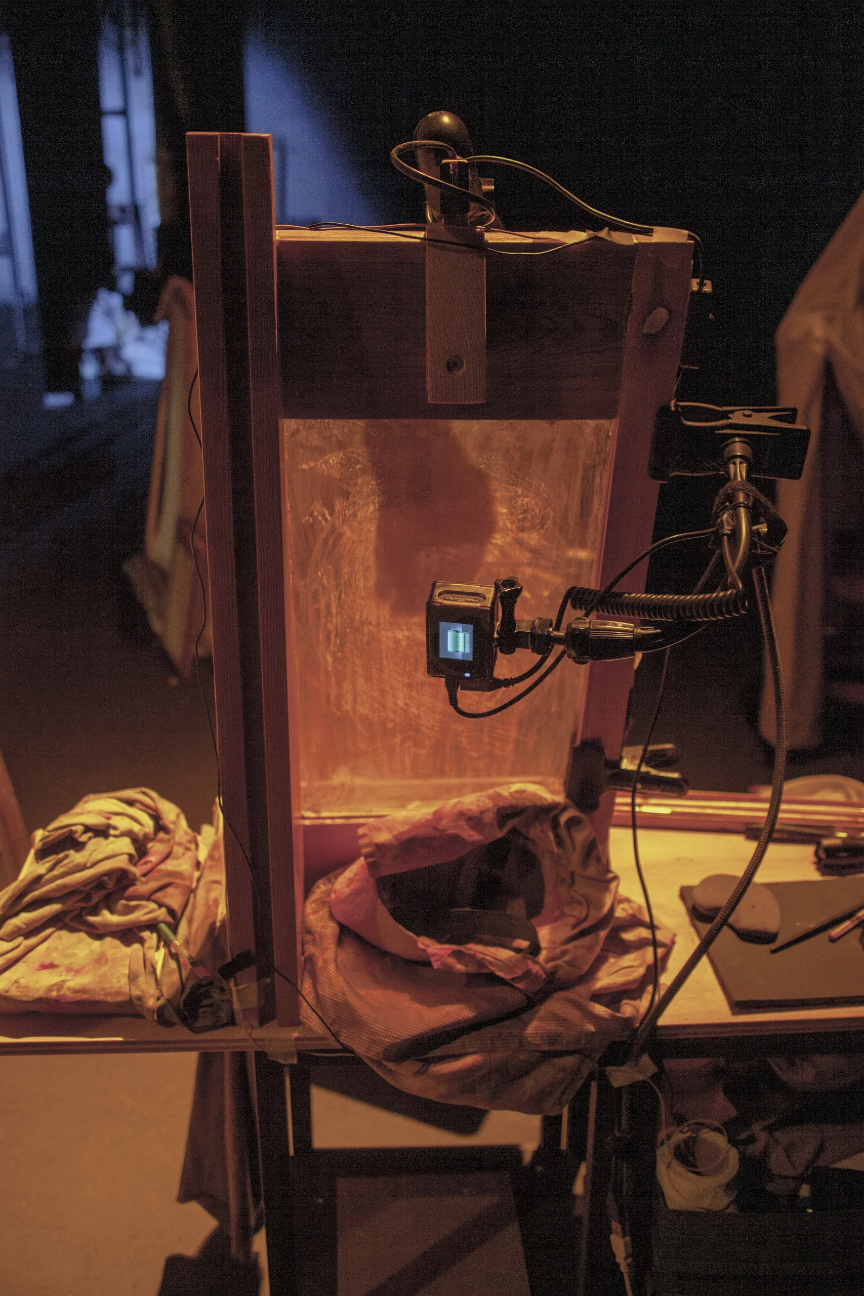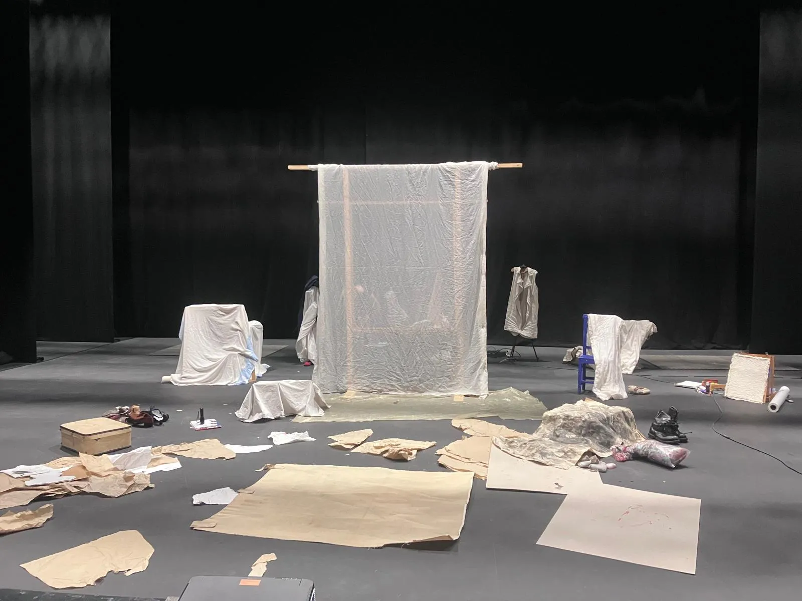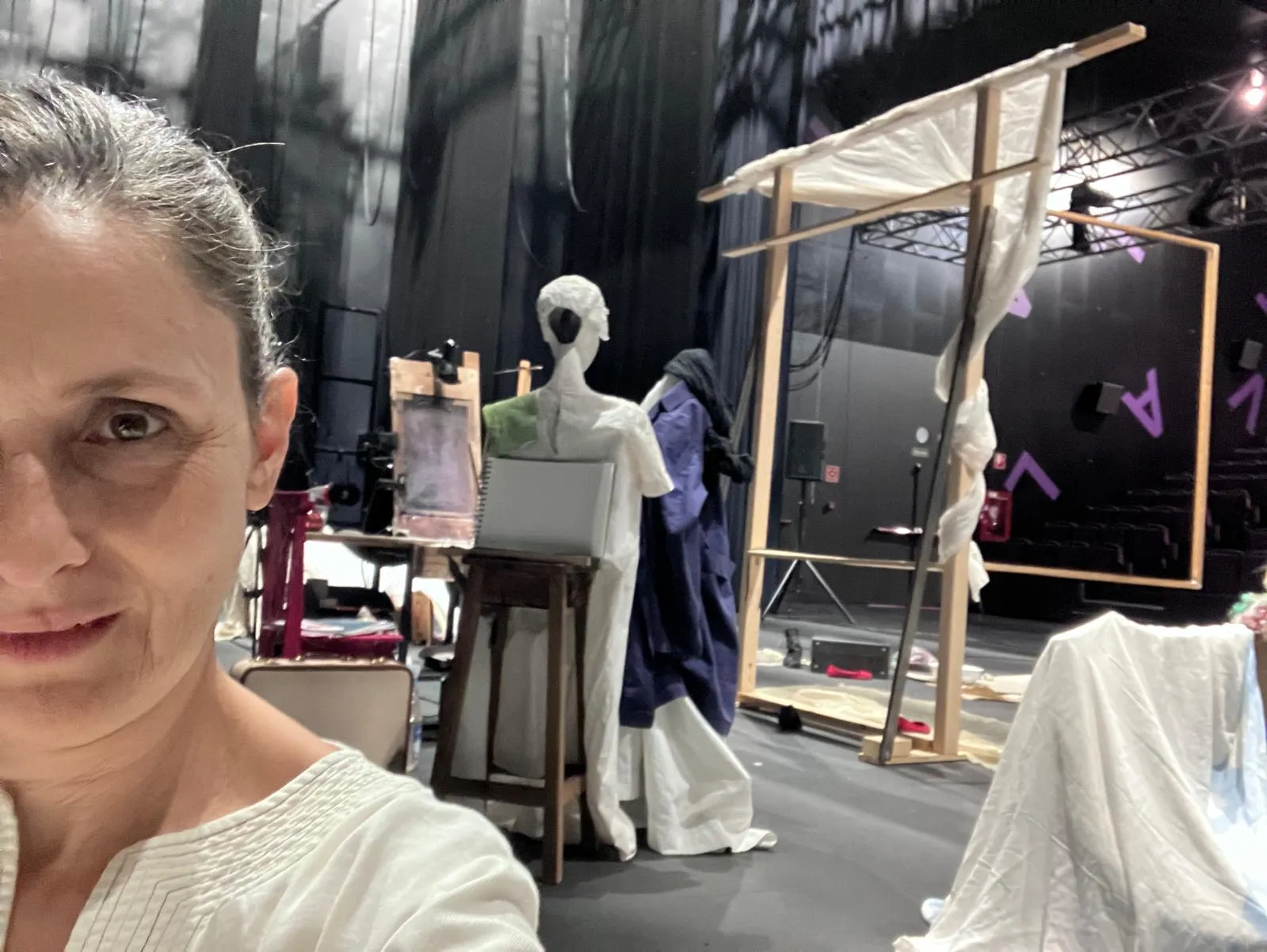 Empezamos a mover elementos y personajes en el espacio escénico. Jorge nos asesora y ayuda con técnicas audiovisuales para su integración: Proyecciones, cámaras, sensores… es un momento en el que nos permitimos soñar.