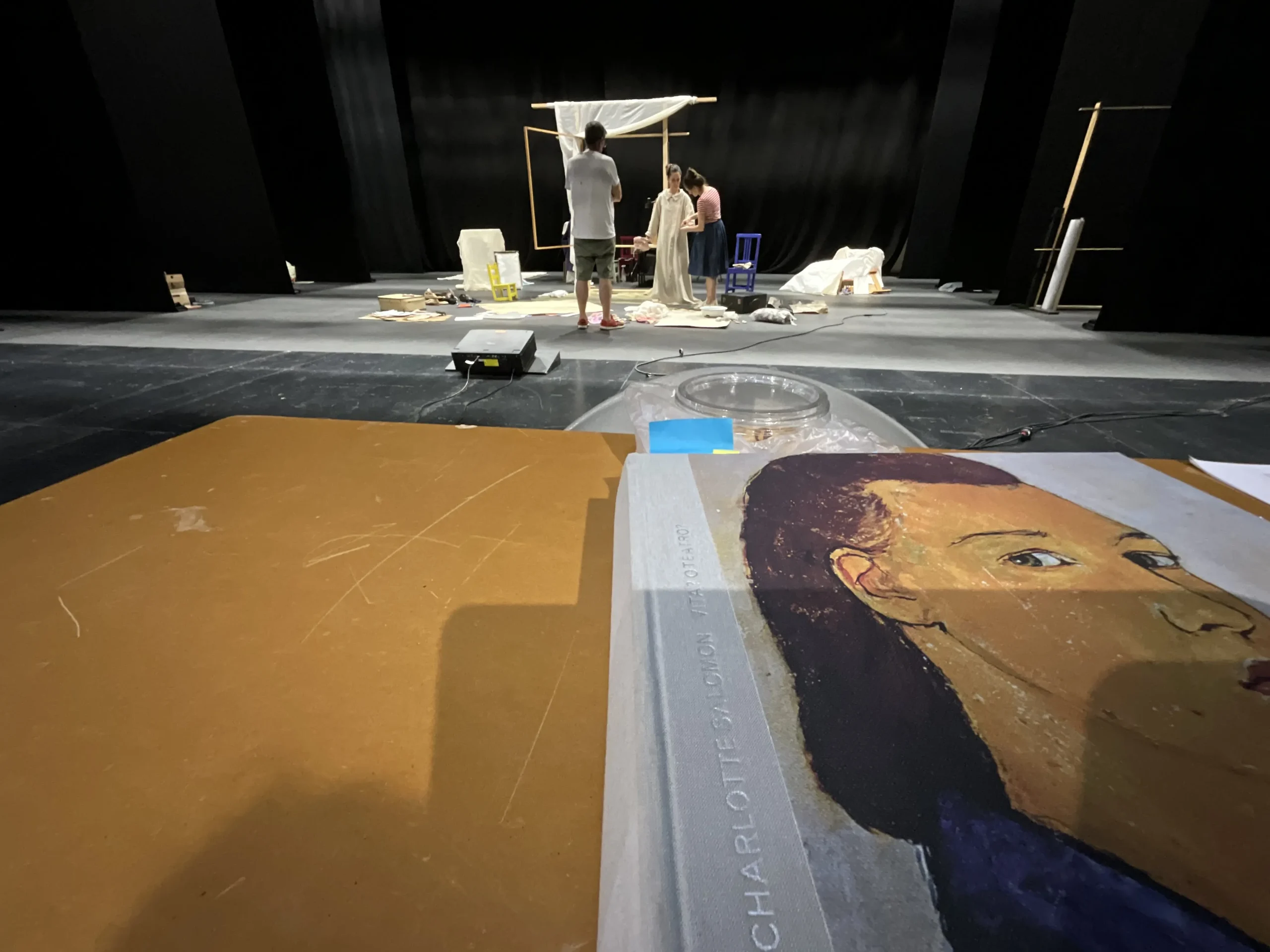 La escena estará dividida en tres espacios frontales y dos en profundidad, tras un rectángulo central traslúcido el universo más íntimo de Charlotte. Una actriz Narradora da vida a láminas, objetos y materiales que «encuentra» en el espacio de delante, por detrás está Ella, la mujer que pinta.