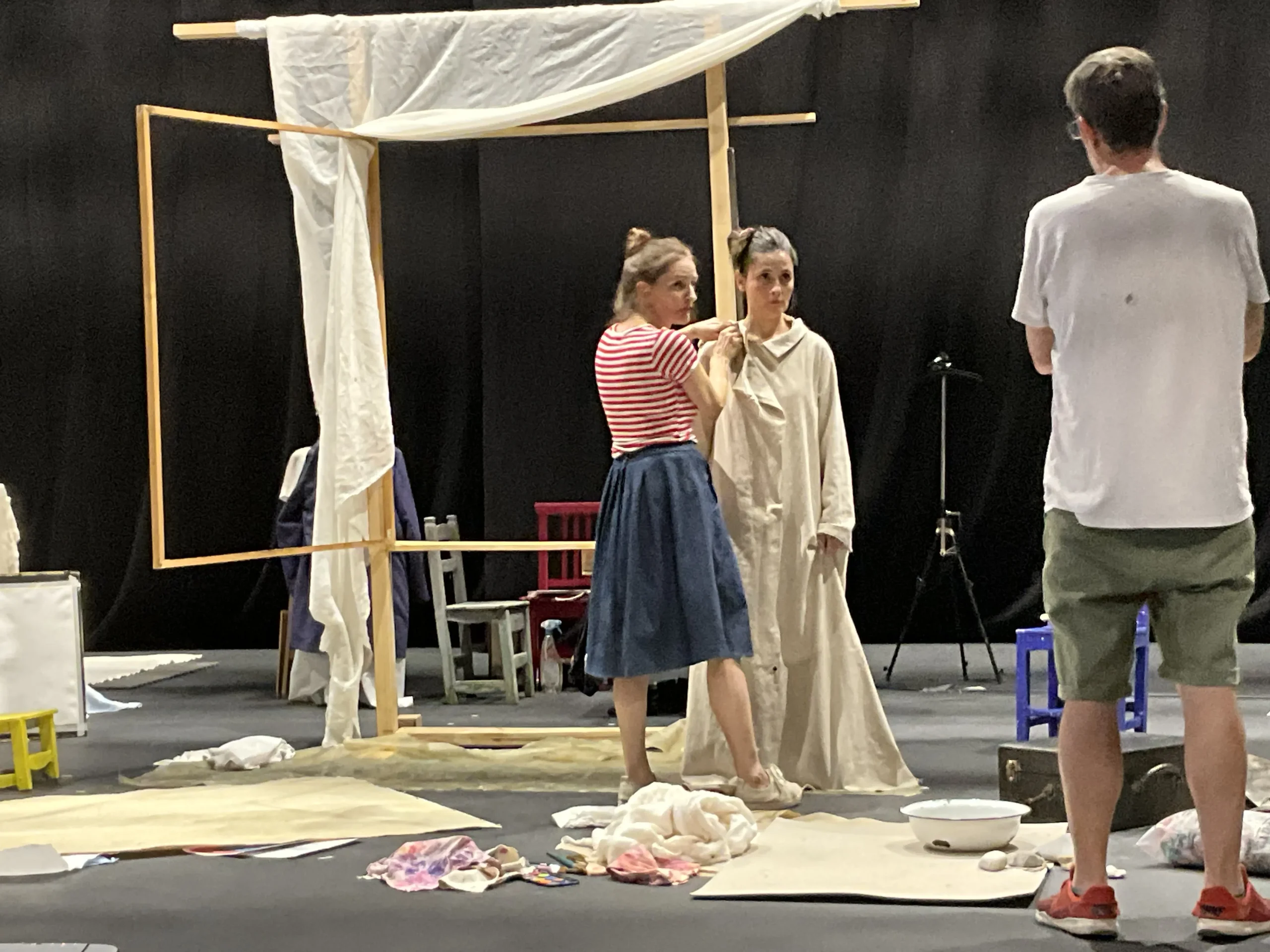 Lupe comienza a diseñar el vestuario de las Narradoras. Encuentra posibles paralelismos de los procedimientos pictóricos aplicables al vestuario que apoyarán estéticamente el empaste de los personajes en fondos proyectados. Capas de color, veladuras de tonos en telas semitransparentes superpuestas.